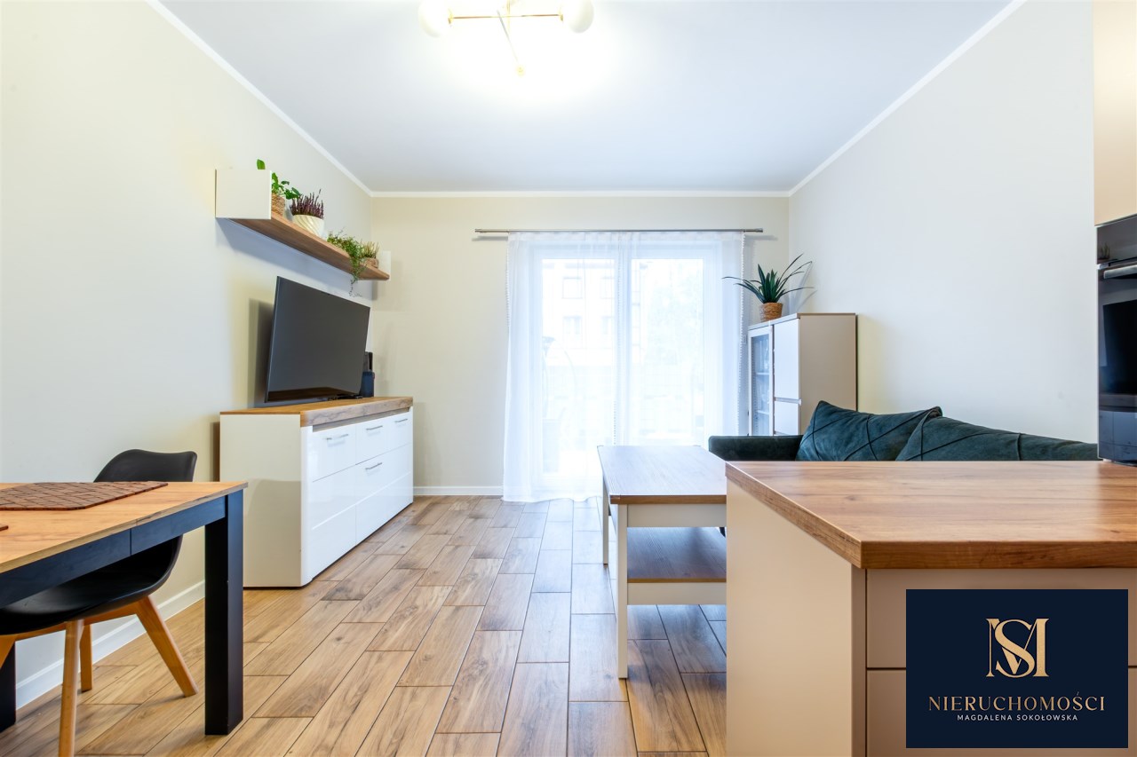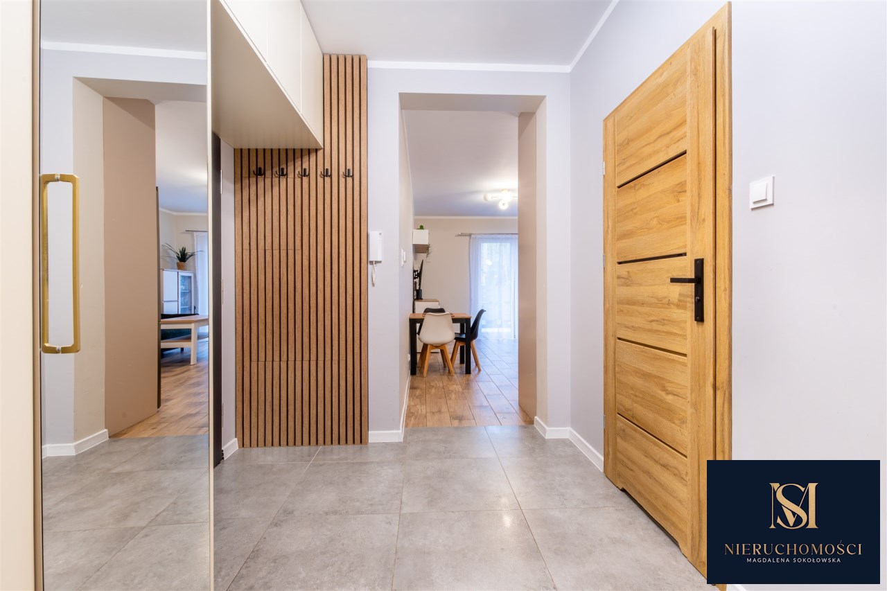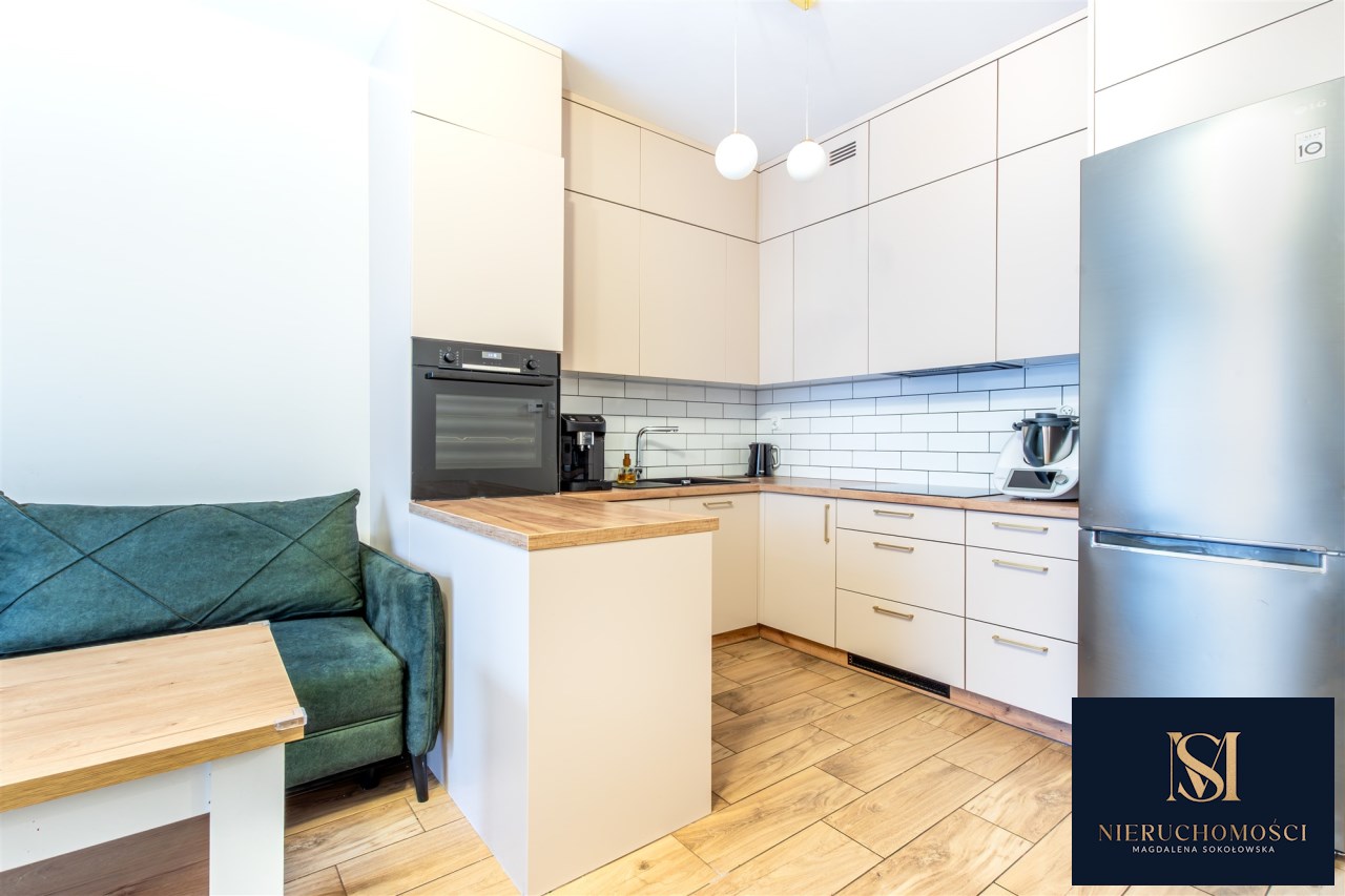 Mieszkanie wyposażone zostało w kuchnię wraz z sprzętem AGD (lodówko-zamrażarka, zmywarka, kuchenka elektryczna, płyta indukcyjna, pochłaniacz), wykonaną na wymiar dzięki czemu idealnie wpasowuje się w przestrzeń i w pełni spełnia swoją funkcjonalność. Łazienka została urządzona w nowoczesnym stylu, zaopatrzona w wannę, miejsce na pralkę oraz suszarkę. W przedpokoju zamontowano pojemną szafę w zabudowie.