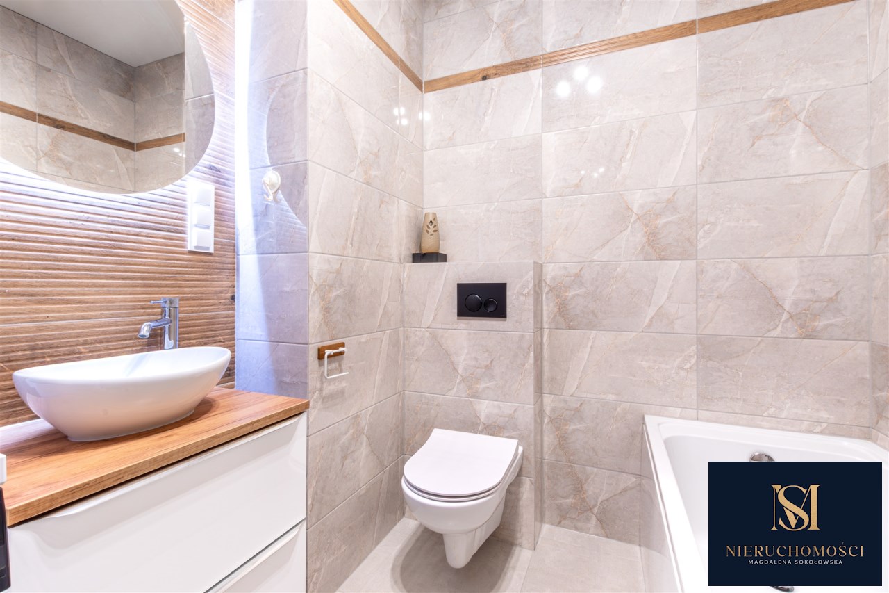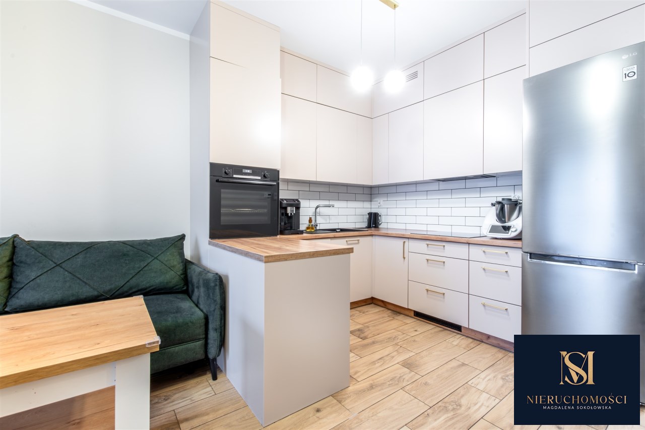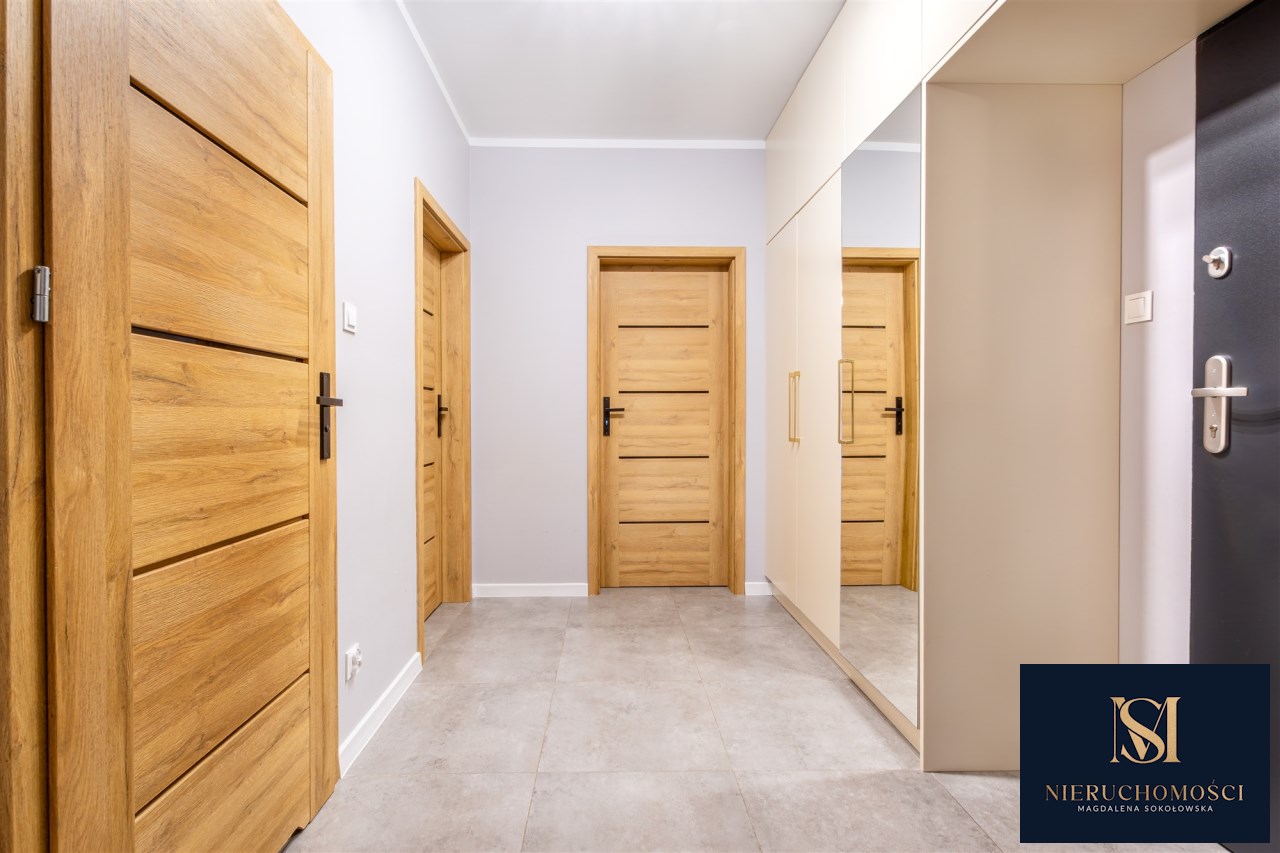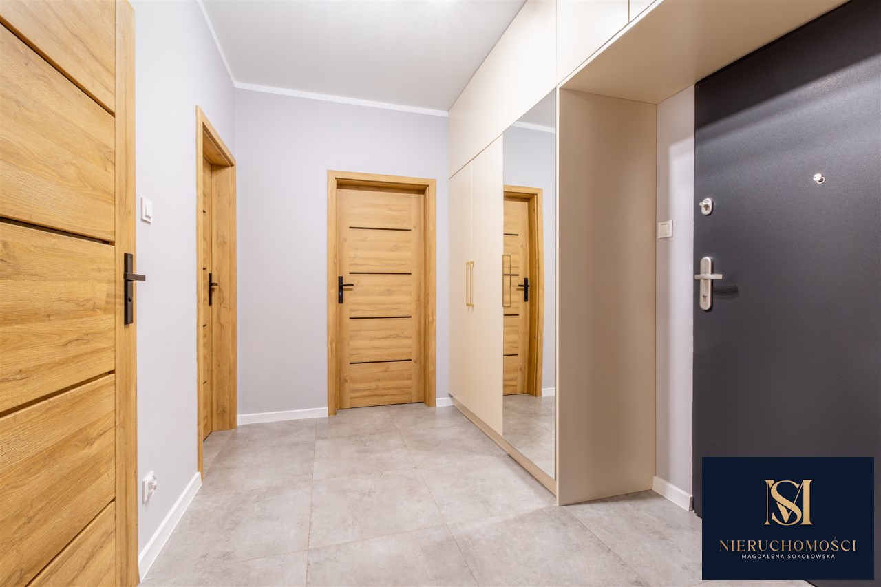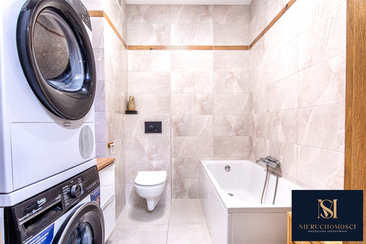 Mieszkanie wyposażone zostało w kuchnię wraz z sprzętem AGD (lodówko-zamrażarka, zmywarka, kuchenka elektryczna, płyta indukcyjna, pochłaniacz), wykonaną na wymiar dzięki czemu idealnie wpasowuje się w przestrzeń i w pełni spełnia swoją funkcjonalność. Łazienka została urządzona w nowoczesnym stylu, zaopatrzona w wannę, miejsce na pralkę oraz suszarkę. W przedpokoju zamontowano pojemną szafę w zabudowie.
