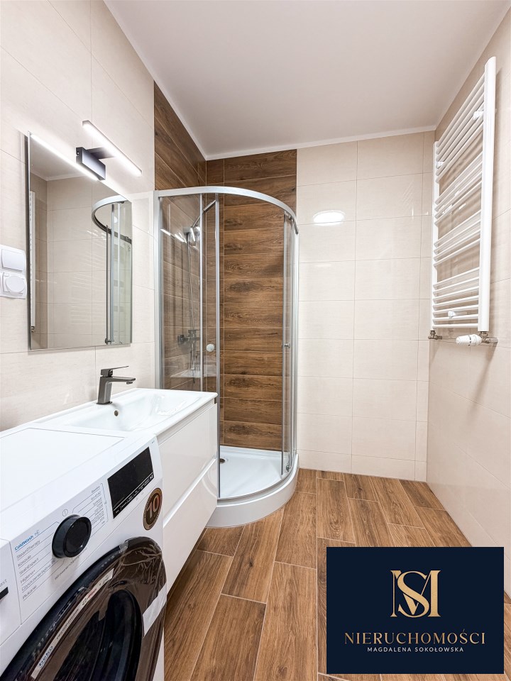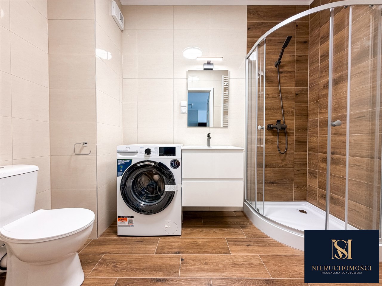Przyszły najemca otrzyma funkcjonalne mieszkanie, wykończone z dbałością o każdy najmniejszy detal. Mieszkanie wyposażono w kuchnię wykonaną na wymiar wraz z sprzętem AGD ( zmywarka, piekarnik elektryczny, płyta indukcyjna, lodówko-zamrażarka).W  łazience zamontowano kabinę prysznicową, umywalkę, wc oraz pralkę